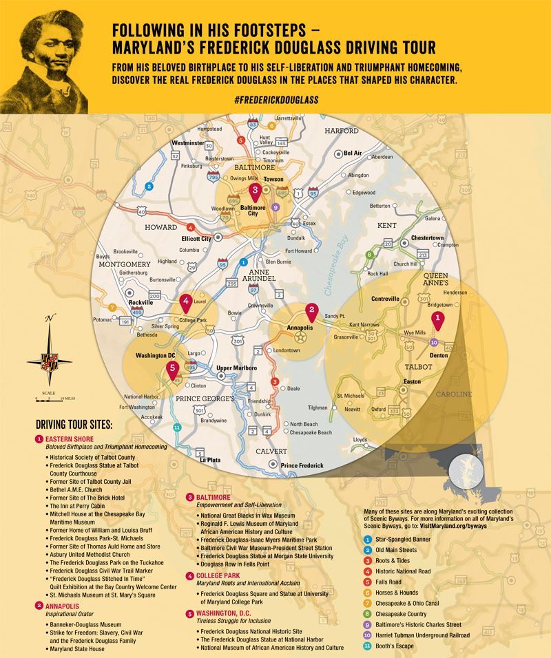 The Frederick Douglass Driving Tour starts at Frederick Douglass Park on the Tuckahoe River near his birthplace. In the park are outdoor exhibits depicting his early years with his grandparents and cousins.