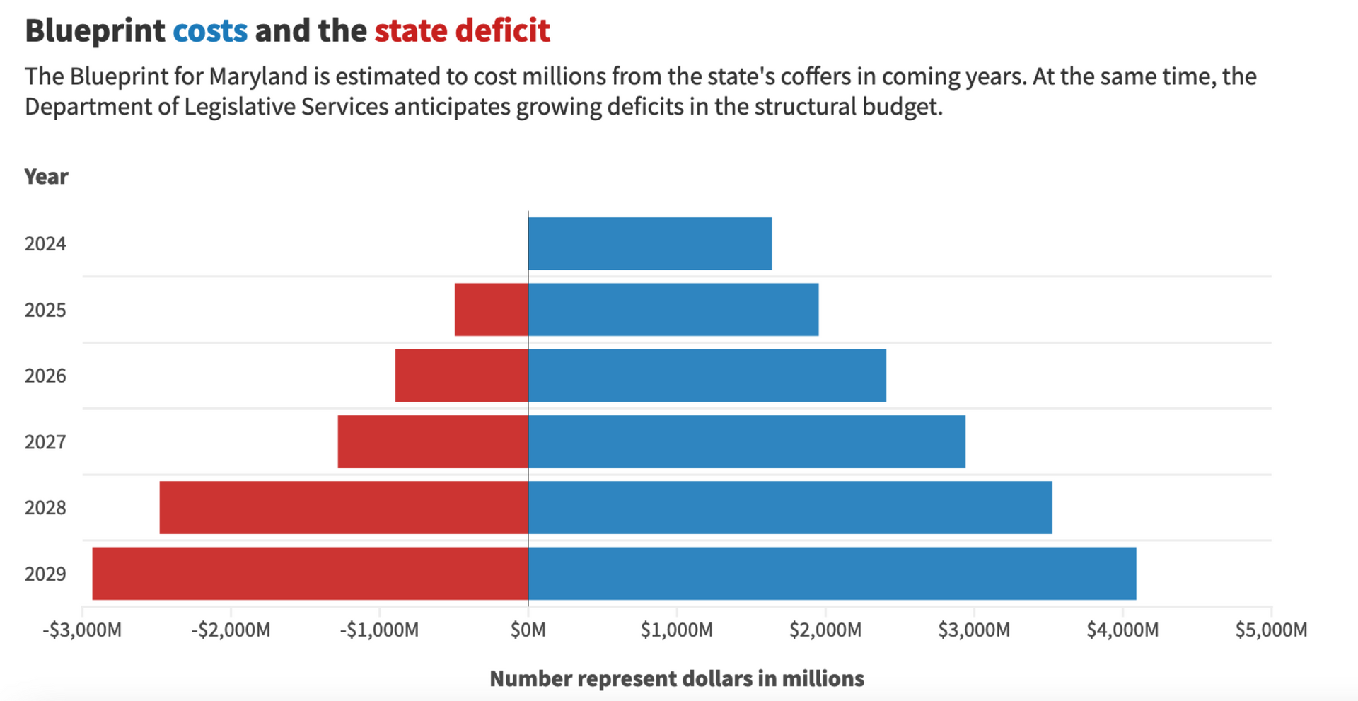 And according to a state Department of Legislative Services fiscal briefing released in January, the state will start running a structural deficit in fiscal year 2025 that will multiply nearly sixfold by fiscal year 2029, when it will hit $2.93 billion. Not coincidentally, that fiscal briefing estimates implementing the Blueprint will cost more than $4 billion in 2029.