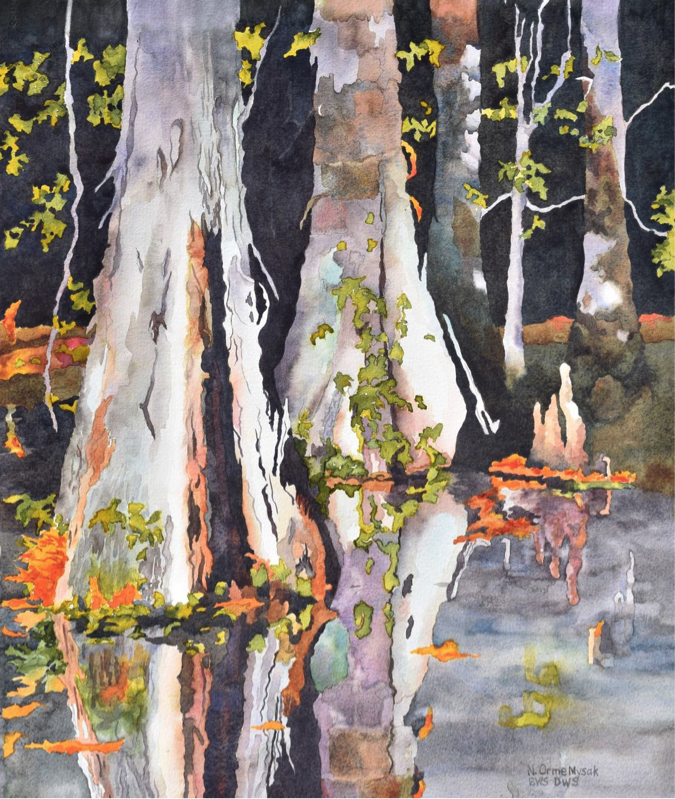 Nancy: I think it is a way to speak. I can say things. Painting for me is like speaking — telling my story. For as long as I can remember, I have used whatever materials were available to make drawings, paintings, and sculptures. Some of my early childhood attempts were truly indescribable! The vibrancy of color and the way light affects color as it falls on an object are usually what attract me to a subject. Nature provides an endless array of subject matter as the light and the atmosphere constantly change. When I have an emotional reaction to a subject, I usually make a quick sketch or take a photo of it. Then, in my studio, I work to capture that important image by using watercolor. I had worked for years painting in oils and acrylics and doing printmaking, but when I found watercolor, I fell in love! Journaling my feelings and experiences through my paintings is an essential and joyous part of my life.