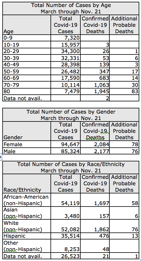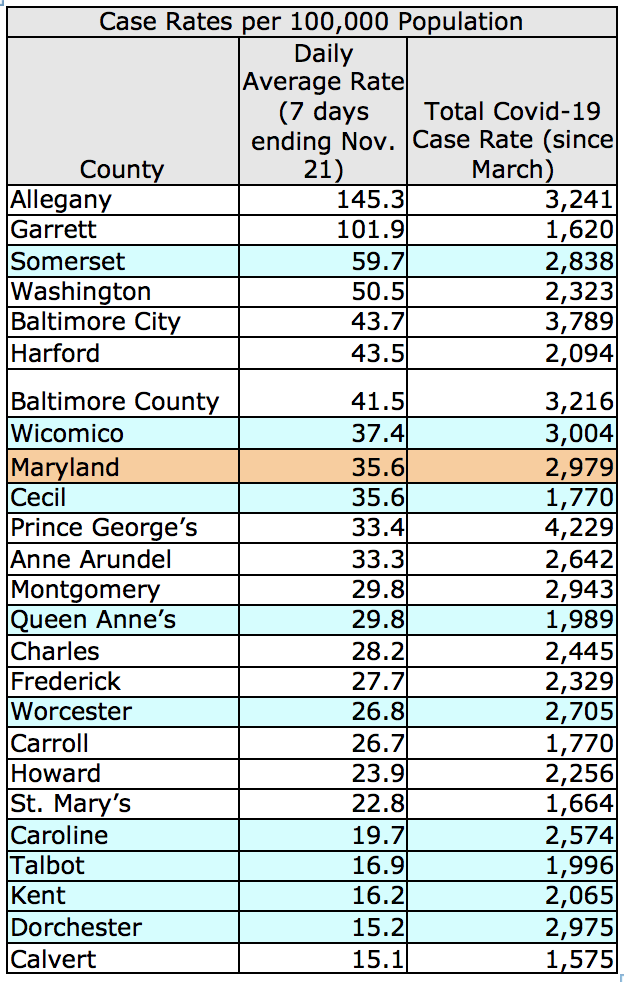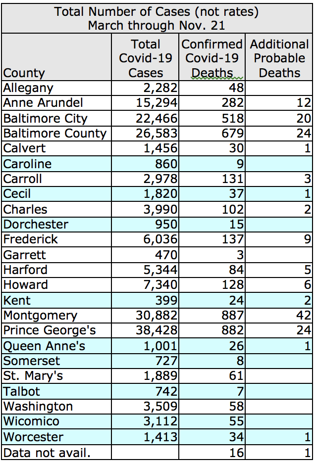 Maryland State and County Covid-19 Statistics as of Nov. 21