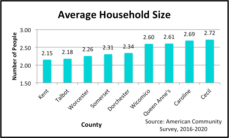 Four of the Shore counties hover around the U.S. and Maryland average. The exceptions are the retirement magnets (Kent, Worcester, and Talbot), and Somerset and Dorchester, all with lower average household sizes.