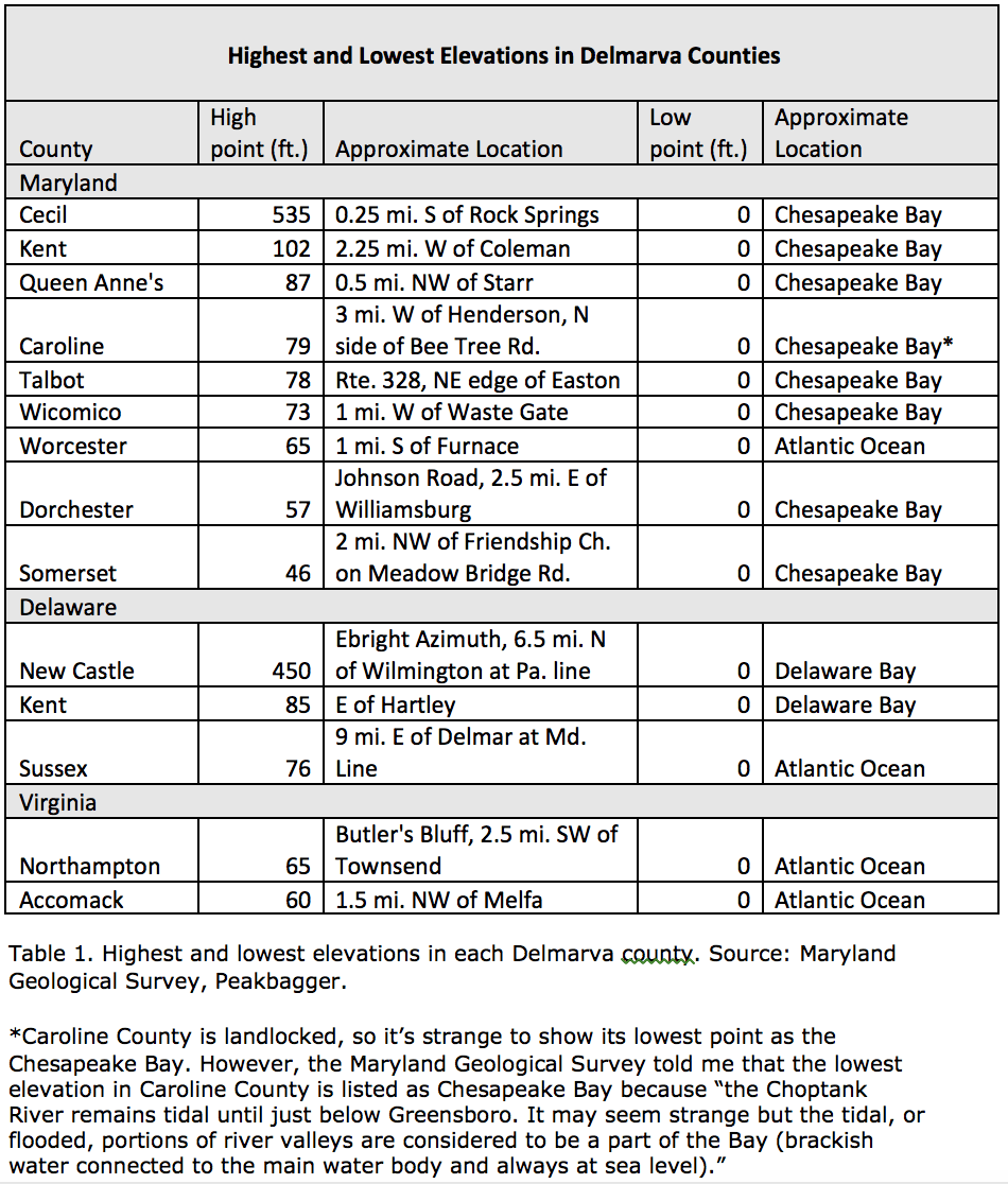 The 14 Delmarva counties are all low-lying, so we’re well-versed concerning what happens with even the slightest increase in water level. The lowest point in all Delmarva counties is 0 feet, either at the Chesapeake Bay, Delaware Bay, or the Atlantic Ocean. The northernmost counties of Maryland and Delaware have the highest elevations, with Cecil County at 535 feet and New Castle County at 450 feet. Kent County, Md. is next at 102 feet. But the majority of the Delmarva counties have highest elevations below 90 feet (the distance between first and second base, or the height of a nine-story building), ranging from 87 feet in Queen Anne’s to 46 feet in Somerset (for comparison, a standard telephone pole is 36 feet high).
