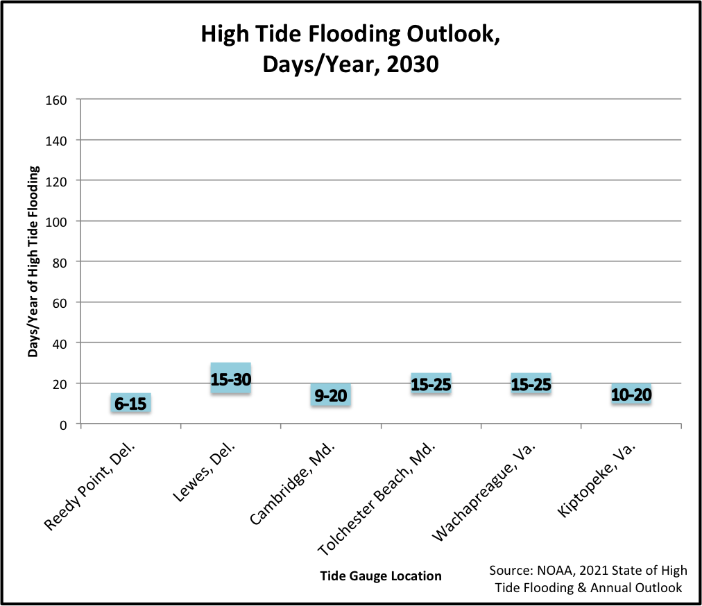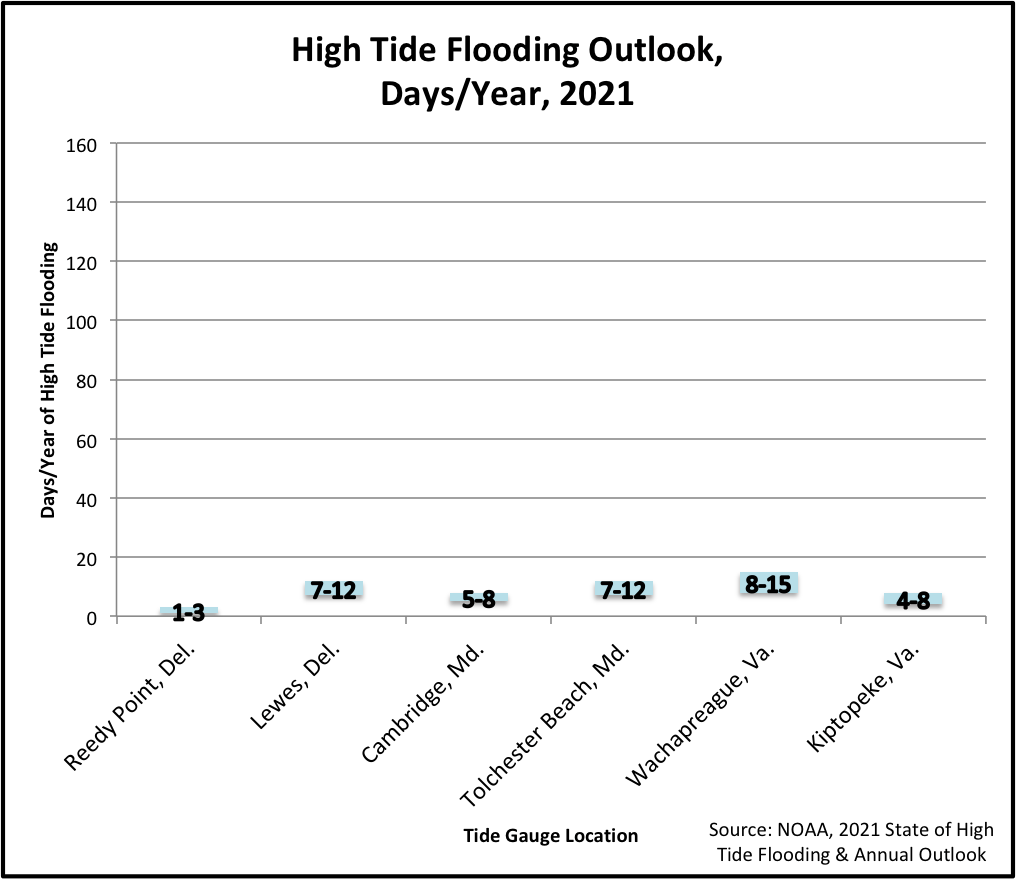 The predictions for 2021 high tide flooding events in the six tide gauge locations are relatively modest: from 1-3 days per year at Reedy Point to 8-15 days per year in Wachapreague.