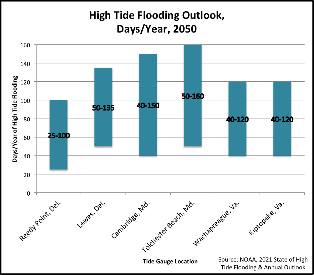 By 2050, NOAA predicts between 25 and 100 days of flooding per year at Reedy Point, and between 50 and 160 days per year at Tolchester Beach — that is, between three and a half and six times of the rate in 2021. (One hundred days per year is eight days per month; 160 days per year is 13 days per month, or over 40% of a month.)