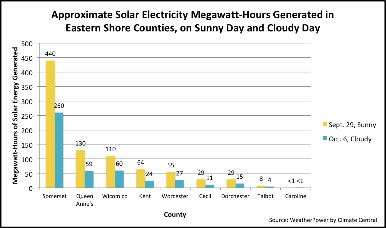 Common Sense retrieved solar power data from WeatherPower for each Eastern Shore county for a sunny day (Sept. 29) and a cloudy day (Oct. 6). Results are shown in the chart below.