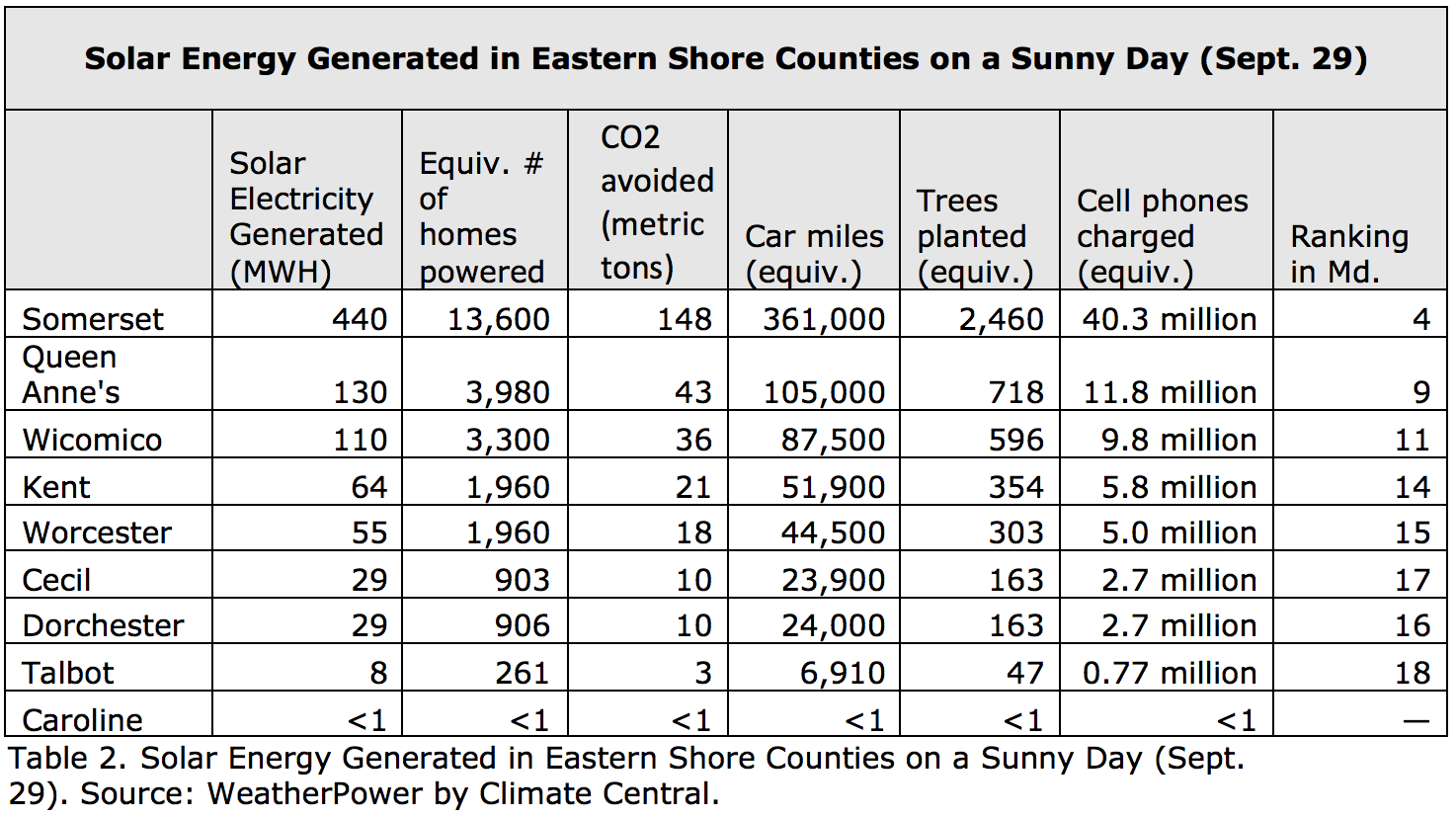 On Sept. 29, Somerset County ranked #4 among Maryland counties in generation of solar energy (Prince George’s was #1, Montgomery was #2, and Baltimore County was #3). Rankings can vary daily.