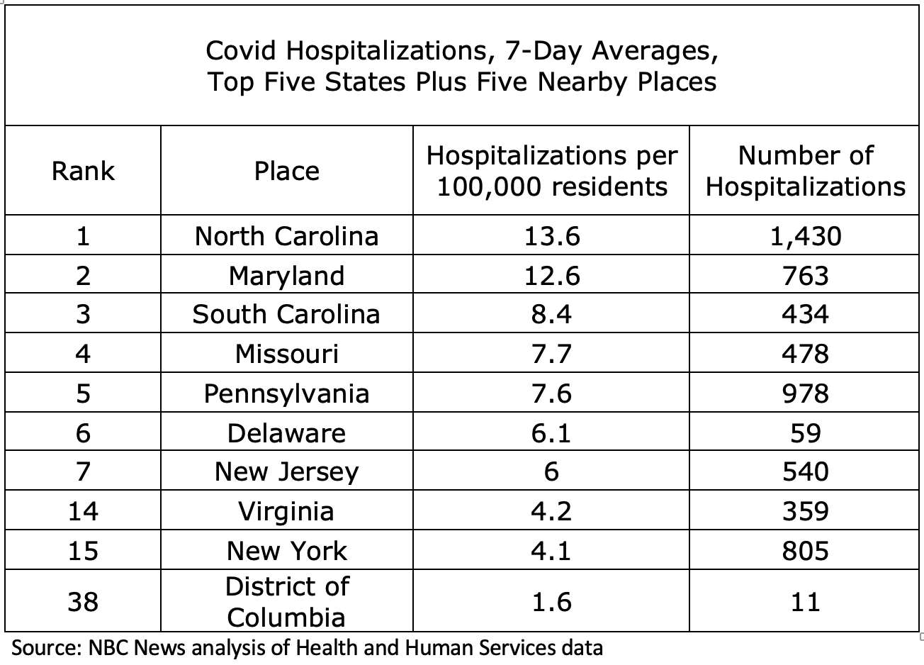 These covid-related deaths and hospitalizations are not spread evenly across the country. There are hot spots that spike first in one community then spread to another city or state. Currently, Maryland with 12.6 hospitalizations per 100,000 population has the second highest hospitalization rate in America. A few weeks ago, Maryland was number one, now North Carolina is with a rate of 13.6.