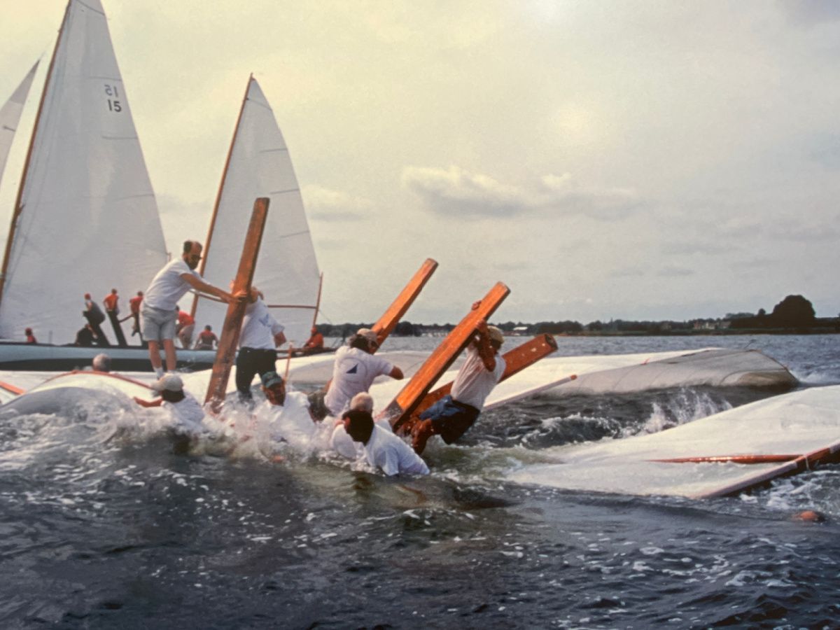 But well before the internal combustion engine eliminated the use of wind power, watermen began racing their log canoes. Some crews even used two sets of riggings. One set of shorter masts and smaller sails worked for dredging for oysters. A second set of much higher masts and larger sails drove the canoes in races. To balance and stabilize the racing boats, springboards or hiking boards on stuck out on the leeward side and were weighted by agile crew members.