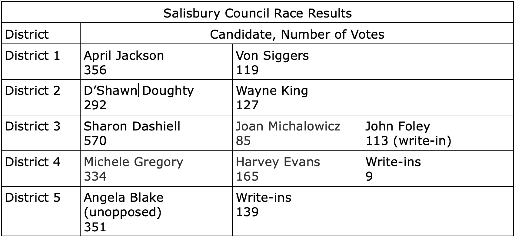 Salisbury elected its mayor and five council seats. Running for mayor were Megan Outten, Jermichael Mitchell, and Randy Taylor. In election night results, Taylor led by 56 votes, with 1,032. Outten was in second place, with 976 votes, while Mitchell received 810 votes. After a count of mail-in ballots on November 9, Taylor extended his lead to 1,120 votes; Outten remained in second place with 1,055, and Mitchell had 861.