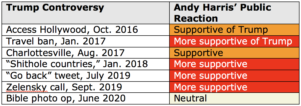 The second element of the Trump Loyalty Index is a gauge of how lawmakers reacted to seven of Trump’s more controversial moments. Rated on a scale of more critical to more supportive, the Axios index looked at public comments made on the record, shown below with Harris’ reactions characterized as to supportiveness. Harris was not critical of the president over any of these controversies.