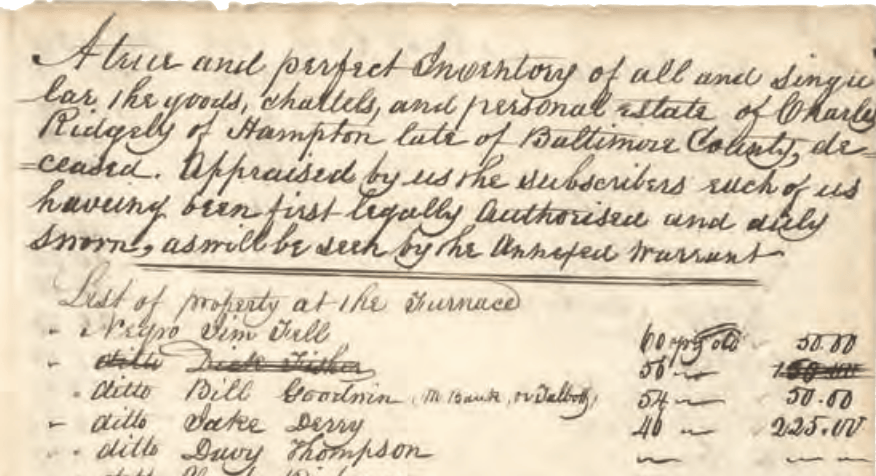 Excerpt from probate inventory of Governor Charles Carnan Ridgely’s property at Northhampton Furnace, 1829. Image: Maryland State Archives