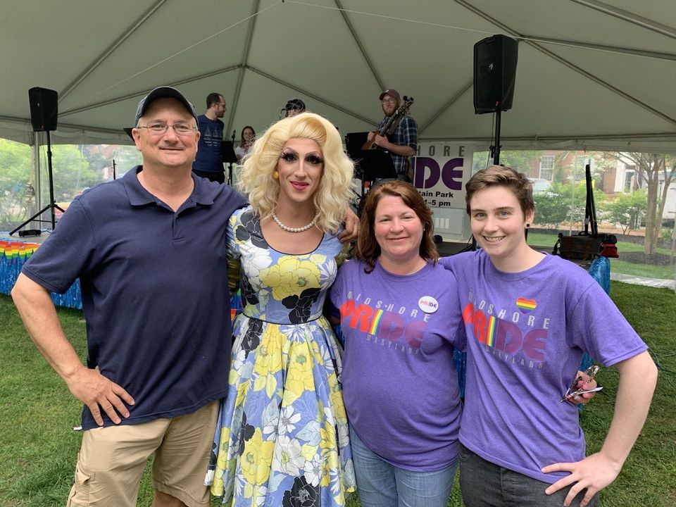 When the time came the outdoor festival in Chestertown, which was strongly supported by the town’s leadership, was attended by some 300–400 people. Speeches from the stage, including those by former gubernatorial candidate Heather Mizeur and Chestertown mayor Chris Cerino, emphasized neighborly love, not political activism. Children were entranced and delighted by a contingent of cross-dressing “drag” performers visiting from New York City, led by Kent County native Marti Gould Cummings. As quoted in the Chestertown Spy , Cummings said, “The truth is, we’re not disgusting. Look at the person next to you—that’s your family.” Numerous local shops and restaurants flew rainbow flags distributed by the downtown business association. Anticipated protests failed to appear, and even the dicey weather cooperated.