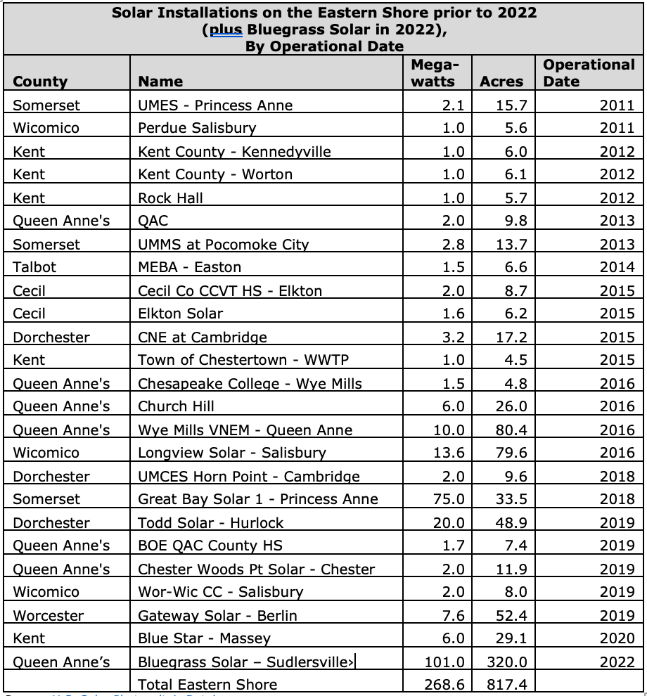 (This analysis also includes the Bluegrass Solar installation in Queen Anne’s County, which came online in 2022, after the USSPD was compiled; this inclusion adds 101mw to the Eastern Shore energy output. Bluegrass is the largest operating solar facility in the state.)