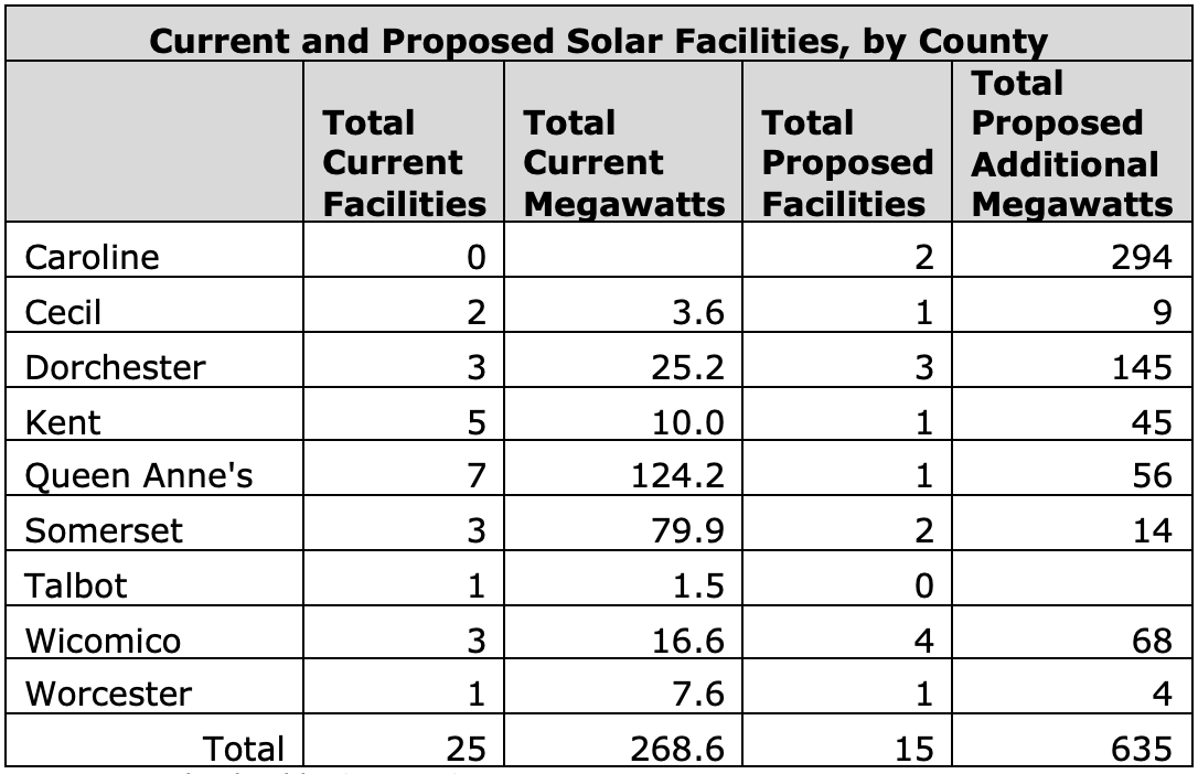 In the past six years, of the 19 solar projects submitted to or approved by the Maryland Public Service Commission, 10 are on the Eastern Shore. Additionally, there are at least five older projects that are not yet operational.