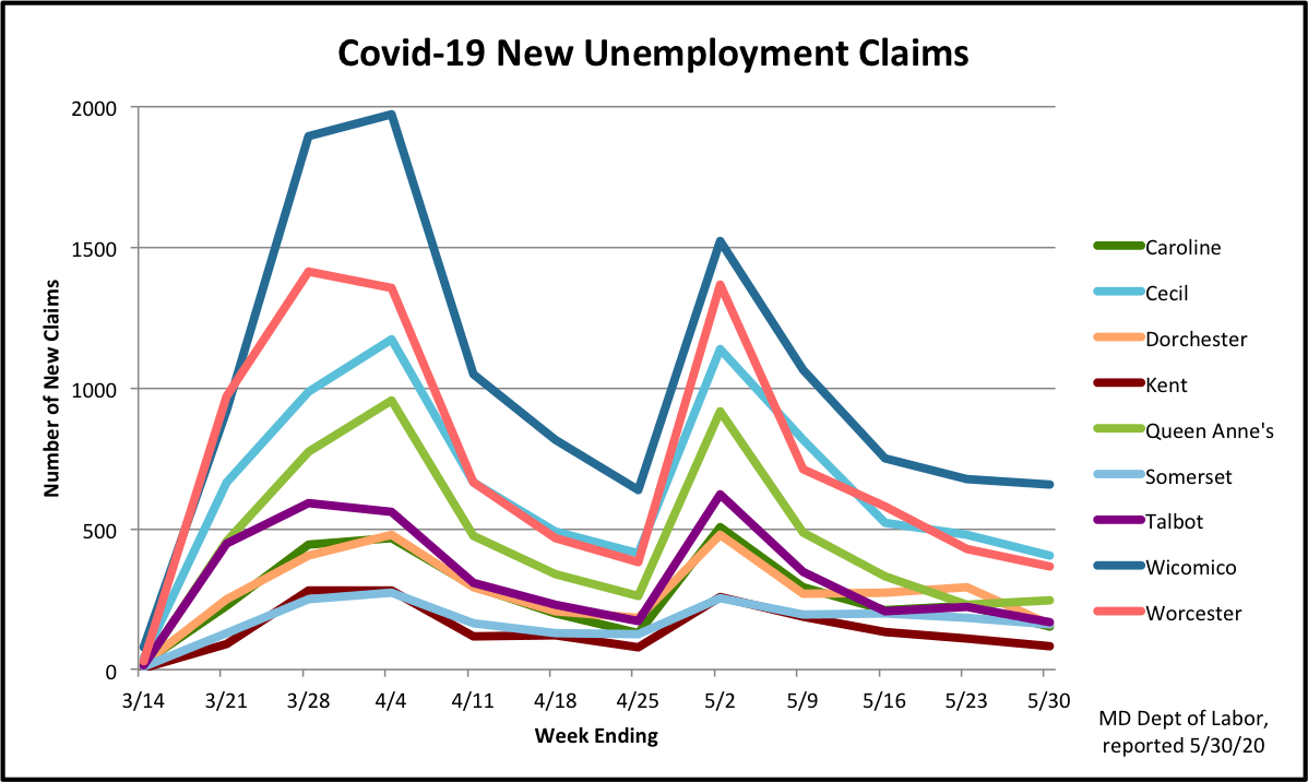 First, initial claims for unemployment have declined for the last four weeks in Maryland and in the counties on the Eastern Shore. (A spike in early May was due to claims submitted under two new federal covid-19 relief programs that expanded eligibility for benefits.)