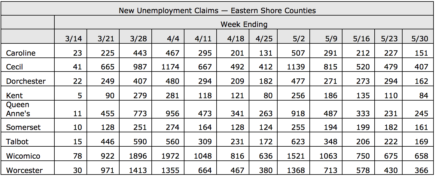 On the Eastern Shore for the week ending May 30, a total of 2,403 new claims were filed — three times as many as the last pre-pandemic week in mid-March, but only one-third of the 7,500 claims filed for the week ending April 4.