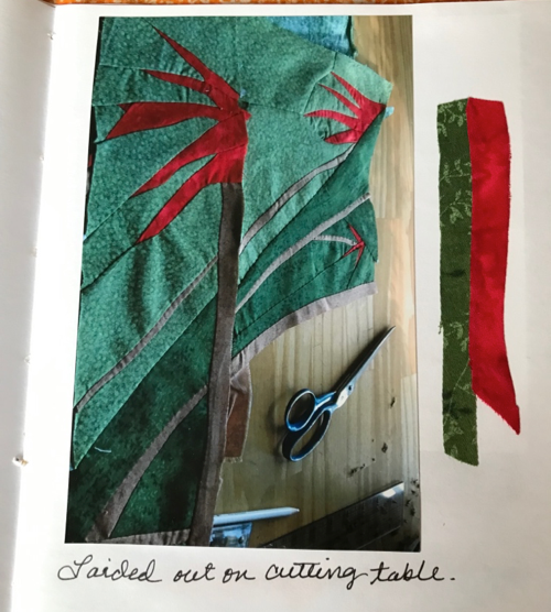 Linda has kept a little book — with a fabric cover, of course, — of sketches, photos, and fabric samples that document the process of the creation of each of her quilts. She starts with a sketch. Then comes the fun of finding fabrics for each piece. She makes a full-size pattern, often revising her first sketch, and attaches a bit of fabric to each piece. And so it grows.