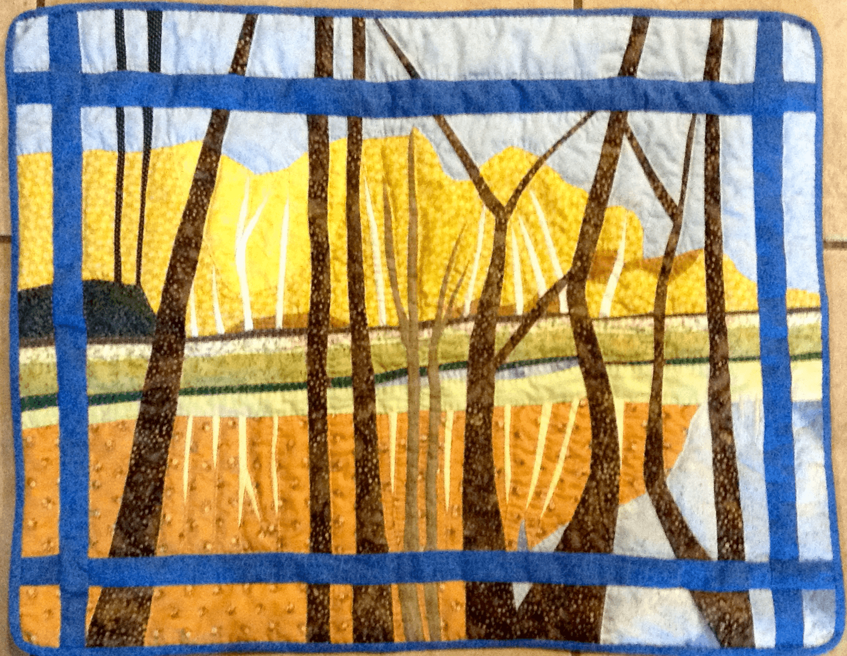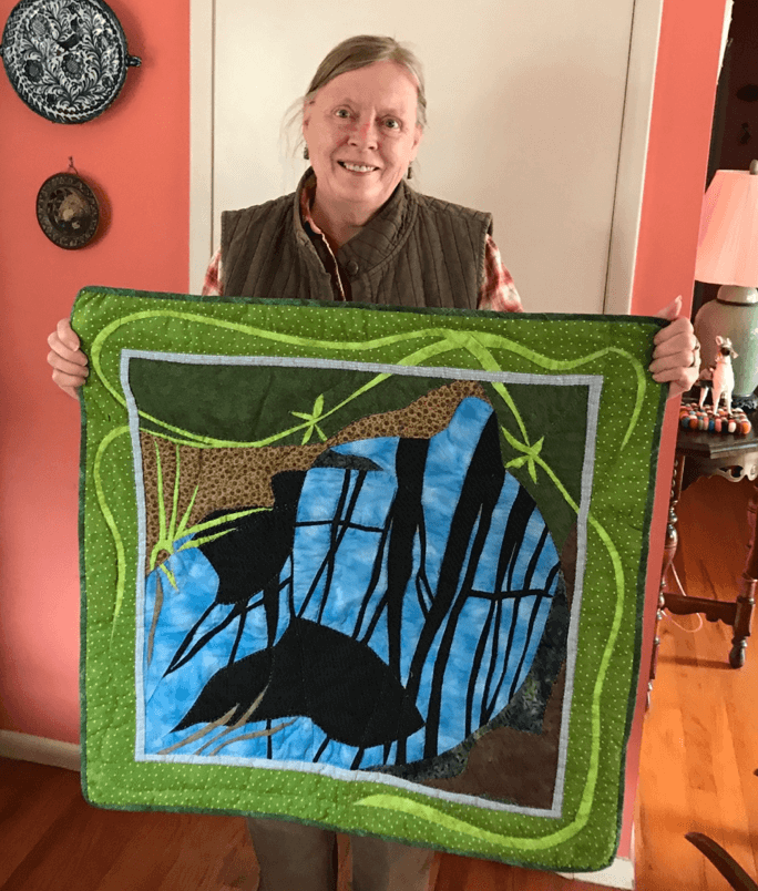 Many of her quilts are of Rosin Creek (Chester Harbor, Queen Anne’s County) where she has lived for many years. It is a very pretty place with many different moods and lots of reflections in the water.
