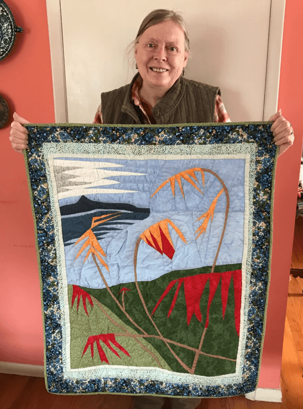 The artist, Linda Walmsley, and her quilt Winslow Park, Maine. Photo by the author.