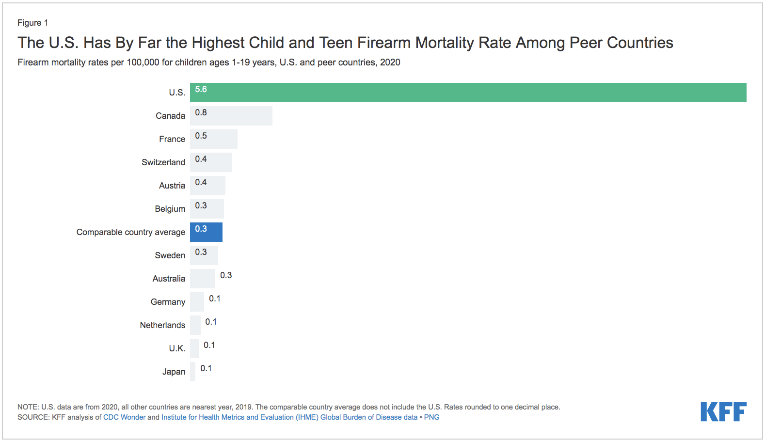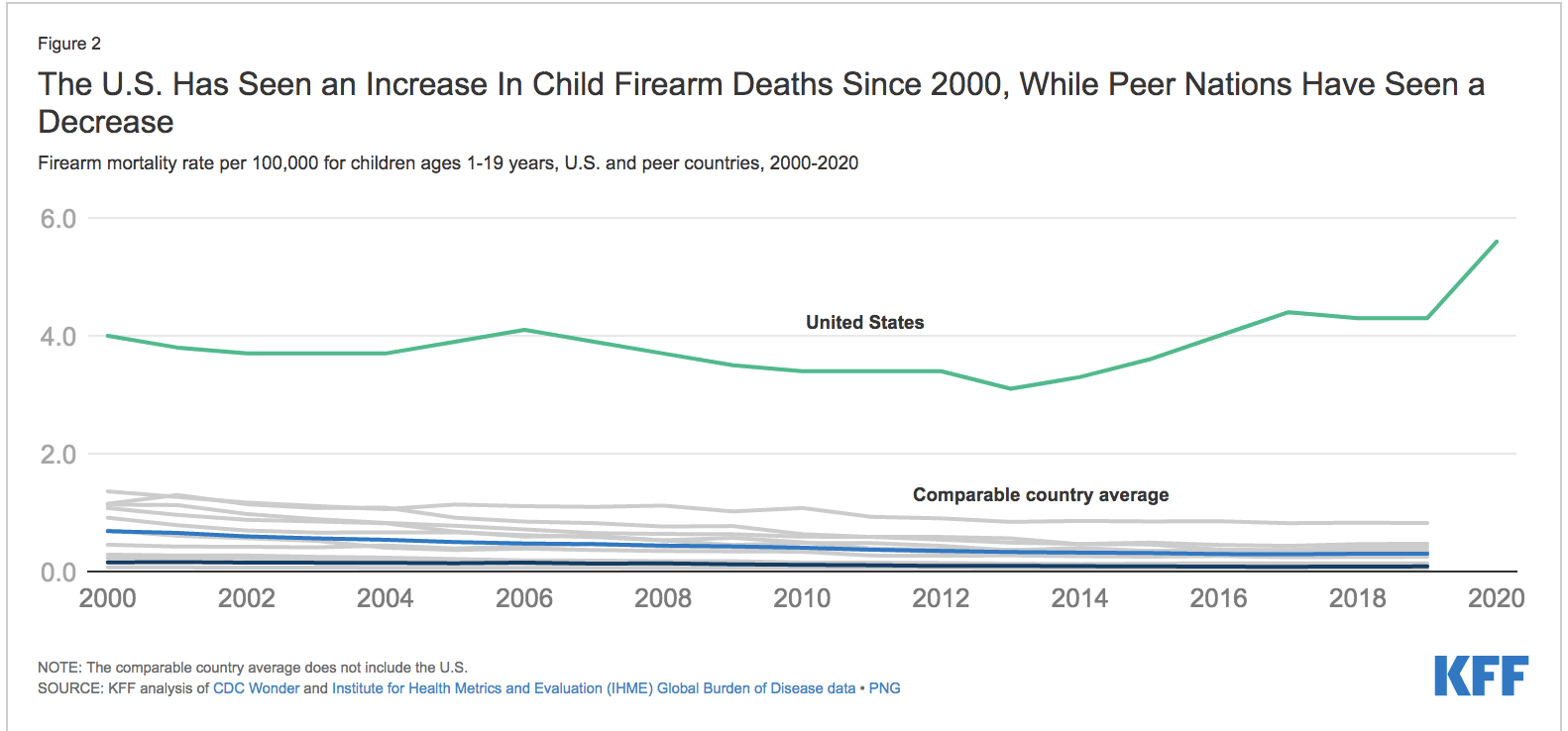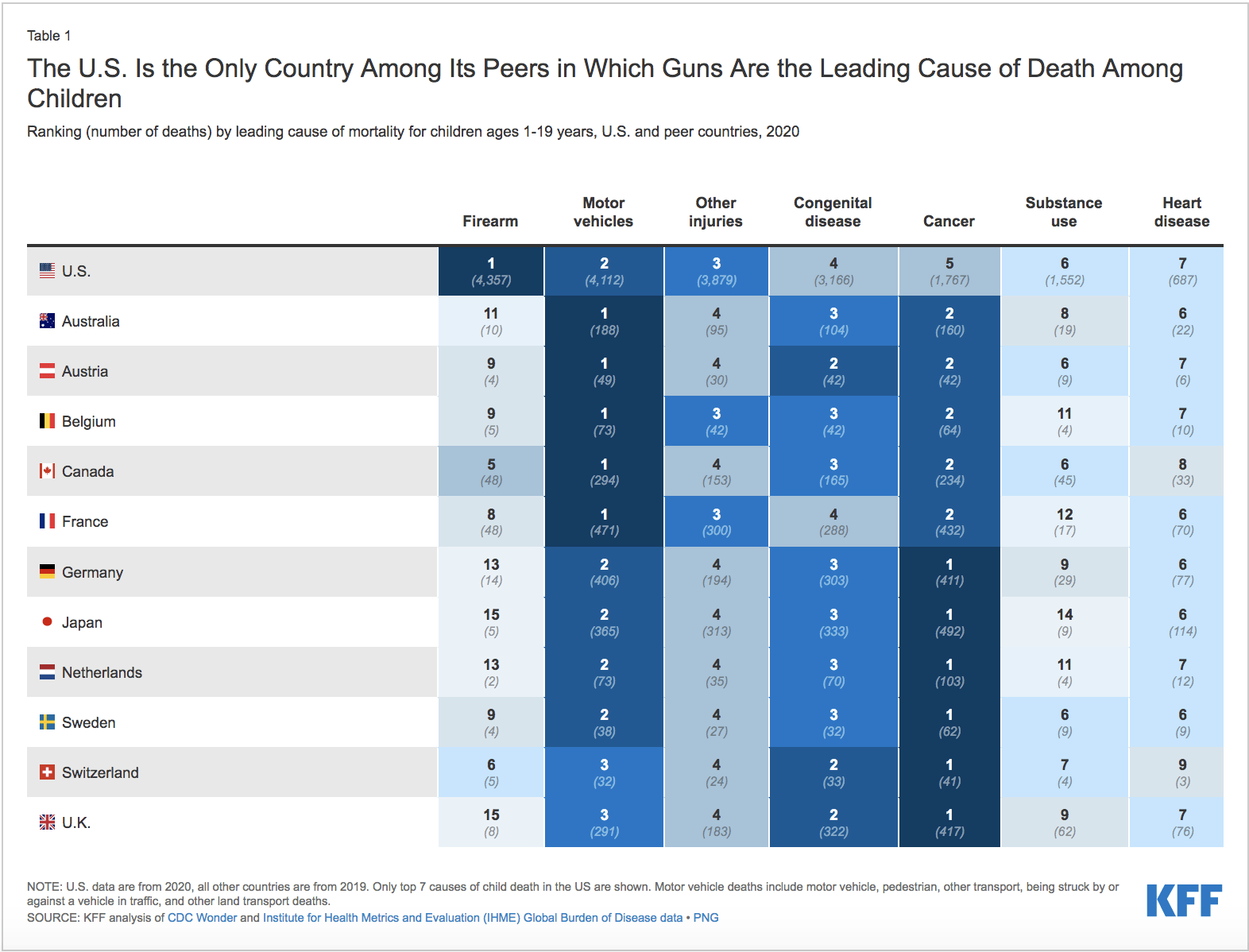 In 2020 (the most recent year with available data from the Centers for Disease Control), firearms were the No. 1 cause of death for children ages 1-19 in the United States, taking the lives of 4,357 children. Except for Canada, in no other peer country were firearms among the top five leading causes of childhood deaths. Motor vehicle accidents and cancer are the two most common causes of death for this age group in all other comparable countries.