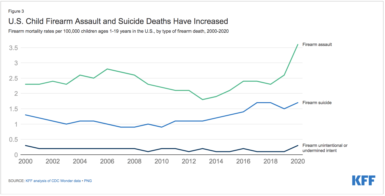 The spike in 2020 child firearm deaths in the U.S. was primarily driven by an increase in gun assault deaths. The child firearm assault mortality rate reached a high in 2020 with a rate of 3.6 per 100,000, a 39% increase from the year before. The firearm suicide mortality rate among children in the U.S. increased 13% from 2019 to 2020, 31% since 2000, and 89% since the recent low in 2010.