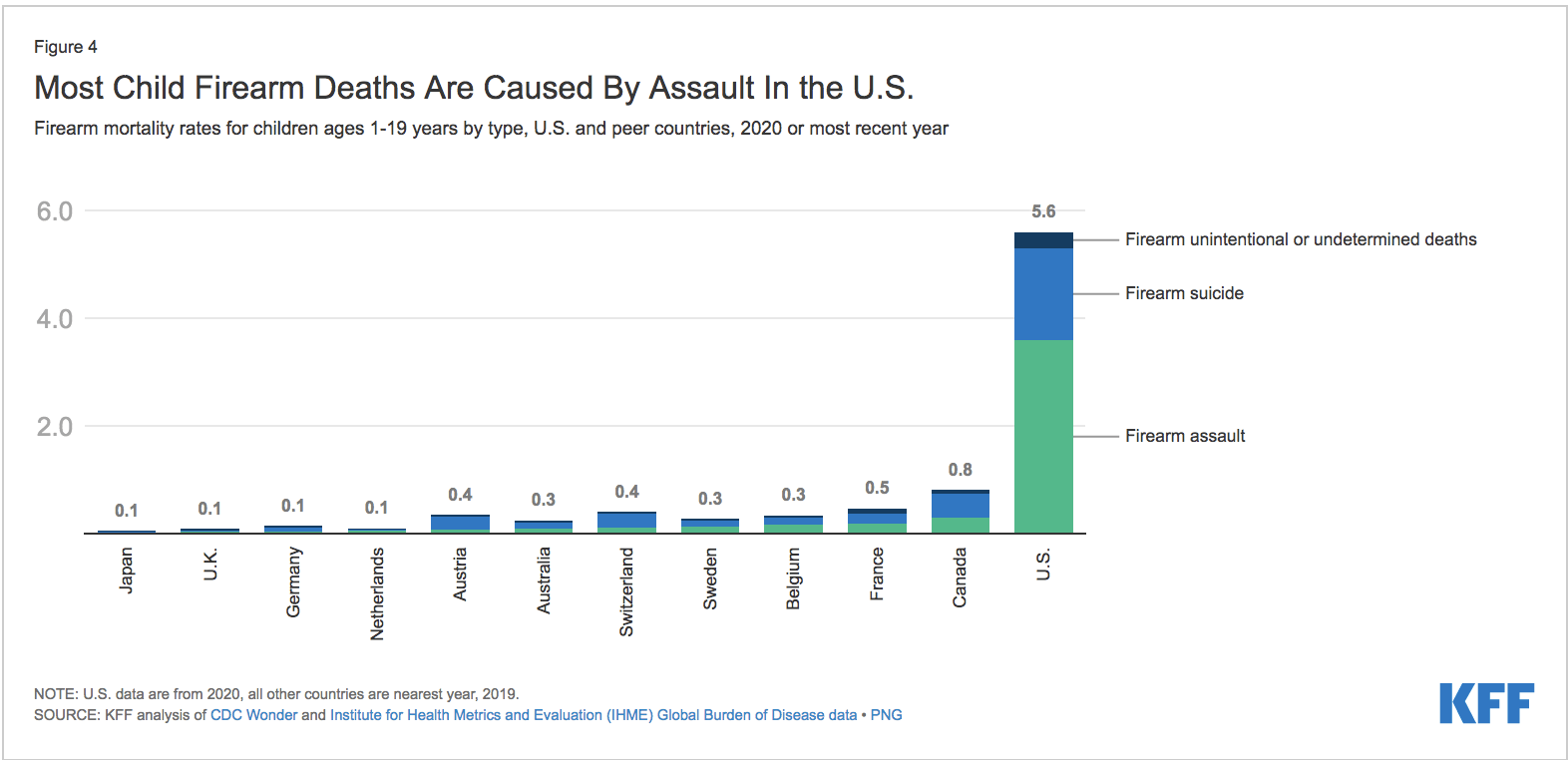 Not only does the U.S. have by far the highest overall firearm death rate among children, the U.S. also has the highest rates of each type of child firearm deaths — suicides, assaults, and accident or undetermined intent — among similarly large and wealthy countries.