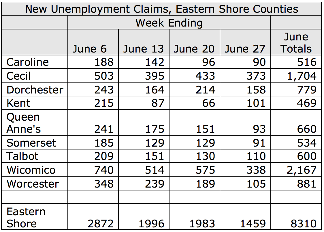 During June, 8,310 Eastern Shore workers filed initial unemployment claims; overall, the numbers of new claims decreased in each of the four weeks, an encouraging sign.
