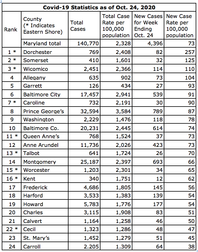 For much of the past two months, September and October 2020, some of the highest rates of new cases of covid-19 in Maryland have been on the Eastern Shore. For the week ending Saturday, Oct. 24, the three highest rates were all in Eastern Shore counties. Of Maryland’s 24 counties, Dorchester led the state with a rate of 257 new covid-19 cases per 100,000 population.
