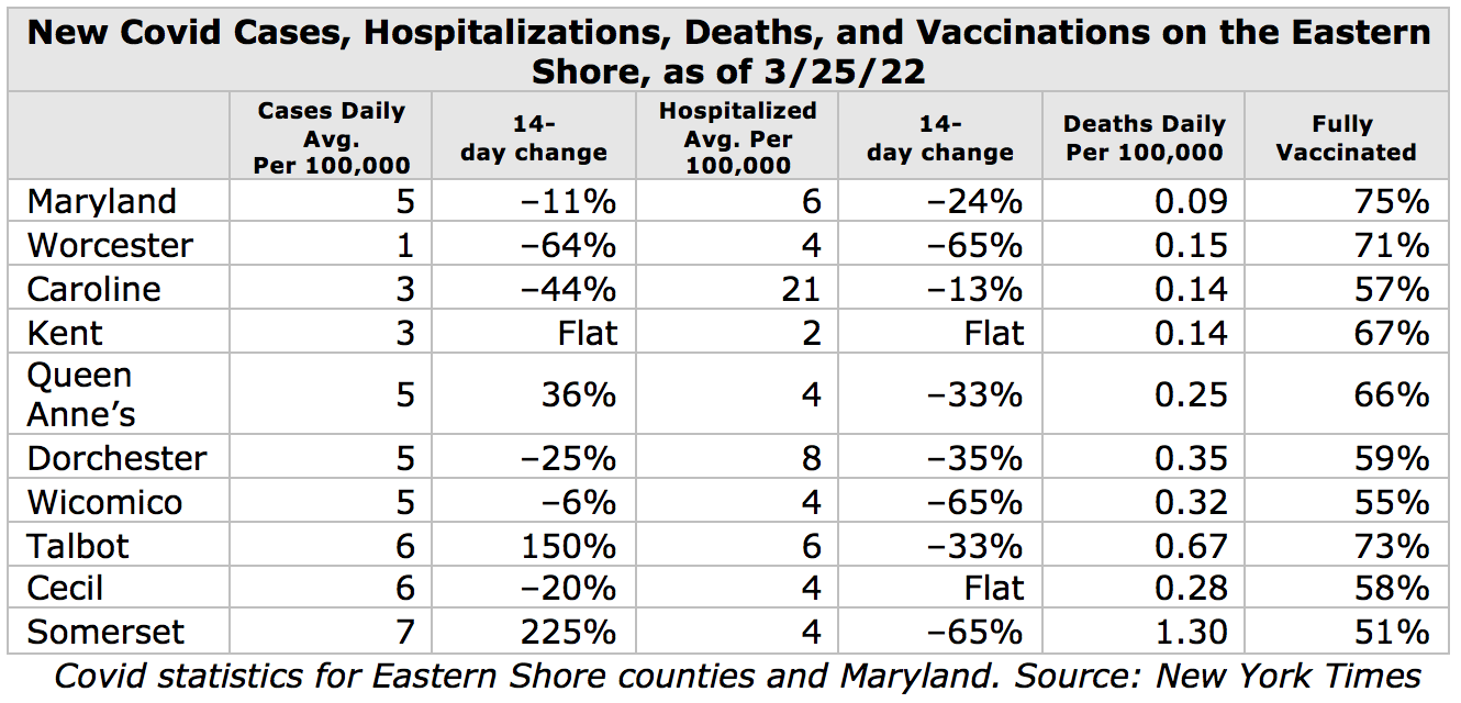 The chart below is adapted from a New York Times interactive database and shows current rates of new cases, hospitalization, deaths, and vaccinations on the Eastern Shore as of March 25, 2022. Remember that these data can change rapidly, especially if new covid variants appear.