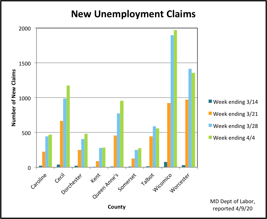New unemployment claims continued to set dismal records across the country, Maryland, and the Eastern Shore during the last week of March and first week of April. Business closures and layoffs because of social distancing and stay-at-home restrictions were to blame. A larger pool of workers newly eligible to collect unemployment benefits as a result of the covid-19 relief bills also helped swell the numbers.