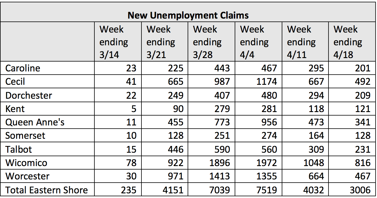 For the fifth week in a row, new unemployment claims on the Eastern Shore numbered in the thousands, signaling that we have not yet reached the end of pandemic job losses. Although down from the peaks seen in recent weeks, new claims continued at an unprecedented rate. In the last five weeks, 25,747 Eastern Shore residents filed for unemployment benefits. For the week ending April 18, new claims on the shore ranged from 121 (Kent) and 128 (Somerset) to 816 (Wicomico). See data table at end of article.
