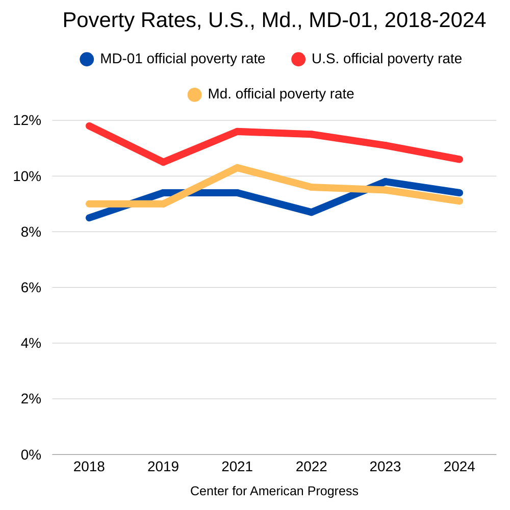 The poverty rate for MD-01 has consistently been lower than the poverty rate for the U.S. during that time and has been close to that for Maryland.