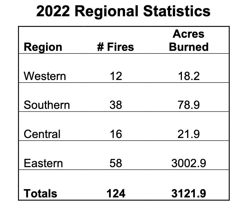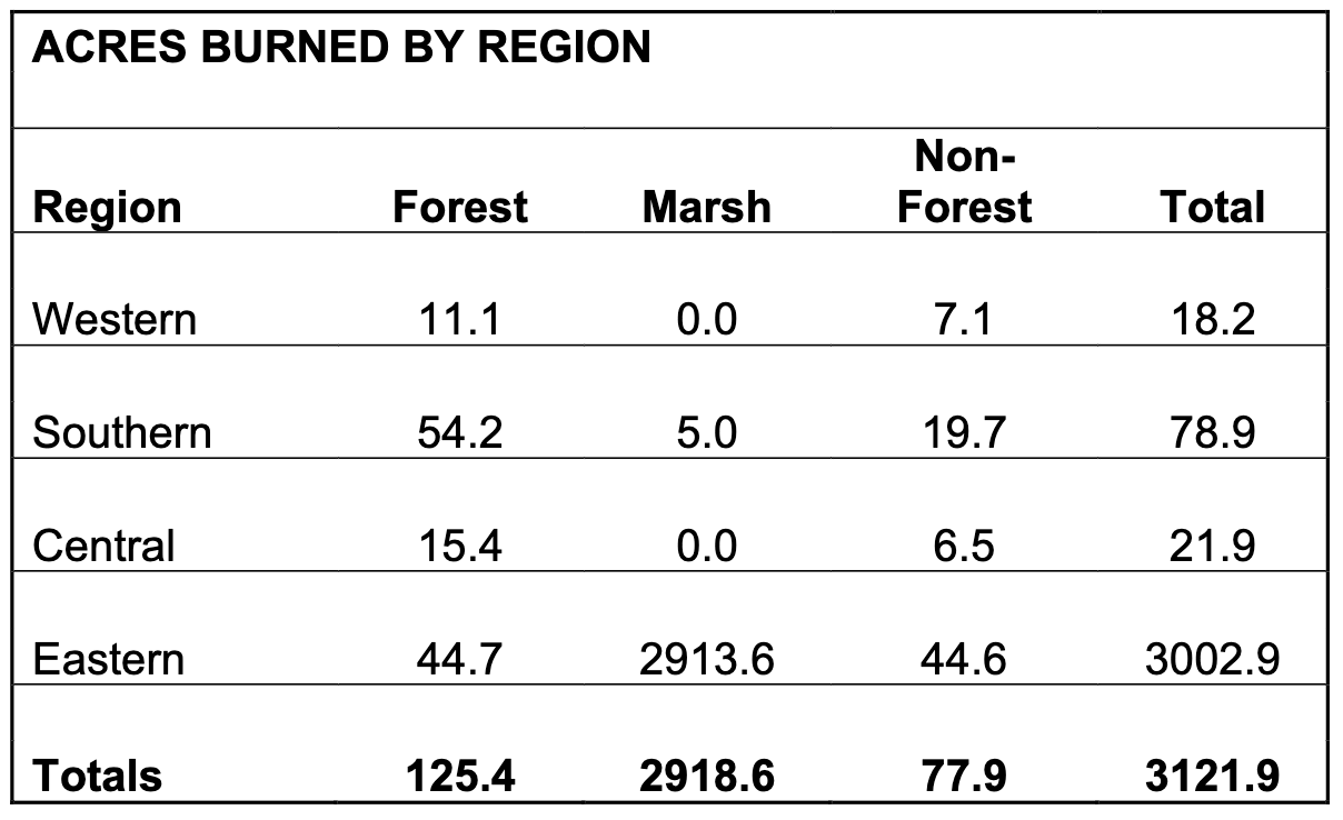 For the fires handled by the Maryland Forest Service in 2021, the Eastern Shore had more wildfires and more acres burned than the four other regions of the state. In 2022, almost half (47%) of the larger wildfires in Maryland were on the Eastern Shore as well as almost all (96%) of the acres burned in those wildfires. in 2015, a peak year state-wide for wildfires, the Eastern Shore had 30% of all fires handled by the Forest Service. However, that 30% was 77% of all acres burned that year in Maryland. The Eastern Shore contains 49% of Maryland’s forested acres and 99% of marshland.