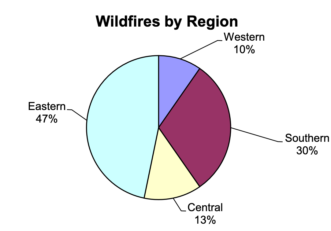 The charts below do not include numerous, generally smaller, wildfires extinguished by local fire departments. They represent only the larger fires where the Maryland Forest Service was involved. The Eastern District includes all of the nine Eastern Shore counties except Cecil.